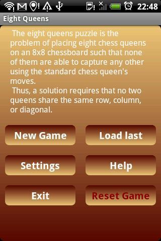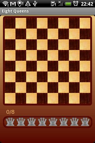 Eight Queens - это проблема размещения восьми шахматных королев на шахматную доску 8x8, так что ни один из них не способен захватить любое другое, используя стандартные шахматные движения.
